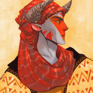 It is from this time that the idea of creating the Tieflings as a visually identified culture developed. Some months prior to this project I had come across the amazing illustrations by Russian artist Phobso who goes by the twitter handle @Phobs0. Phobso’s illustrations of Tieflings wearing long patterned clocks, bodies bedeck in jewellery, shared motifs of triangles across both cloths and face paint, result in a stylistically cohesive race of people that I could not help but fall in love with. They are a true people. Not just that one family in your village touched by the demonic, but their own civilisation with a rich culture and history that allows for a vast amount more roleplaying potential than is normally there for a Tiefling player.
